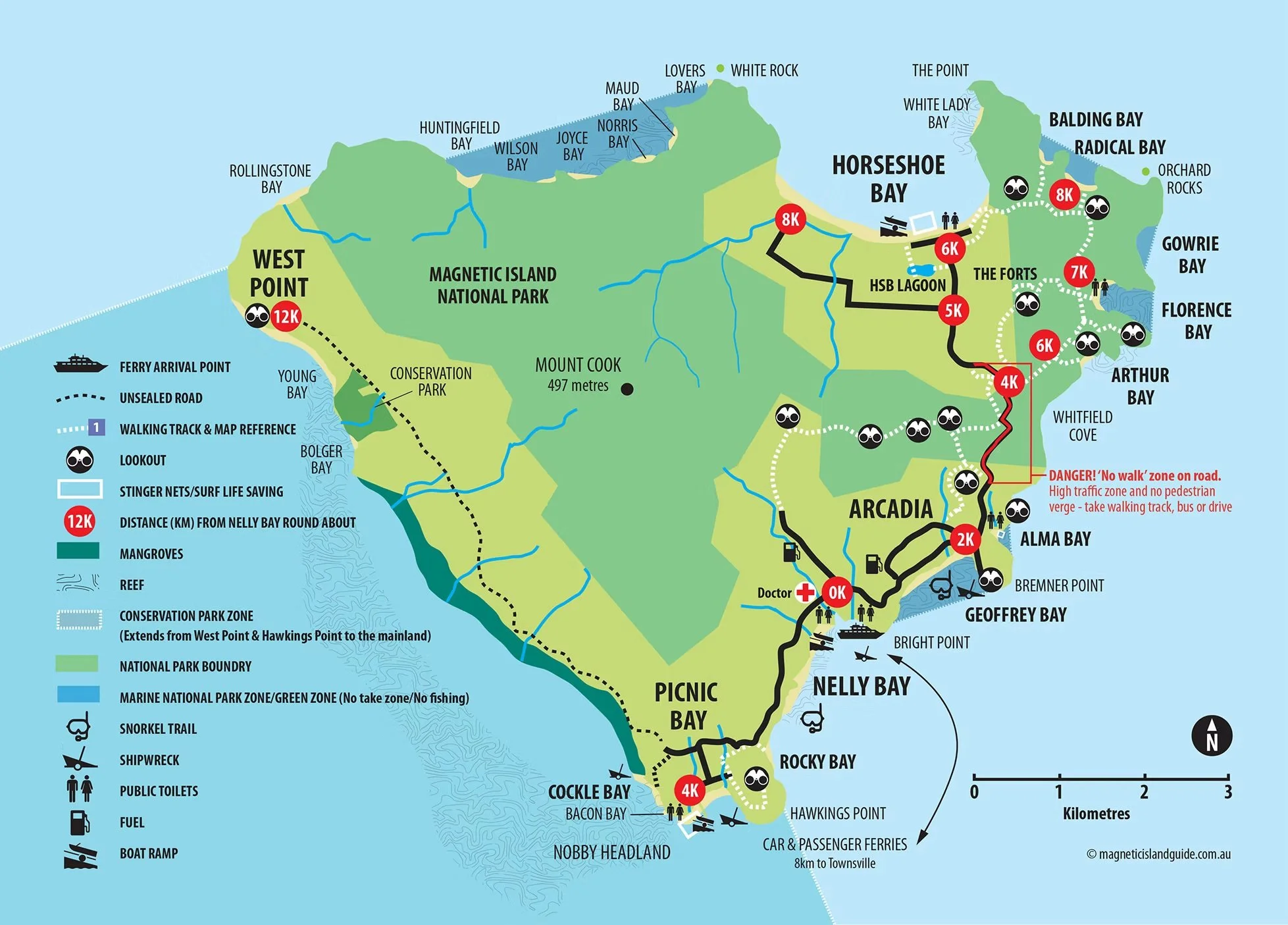 Explore the eastern side of Maggie, Orchard Rocks, Florence Bay, and Arthur Bay, then zoom past Whitfield Cove, Alma Bay, Geoffrey Bay, and Nelly Bay